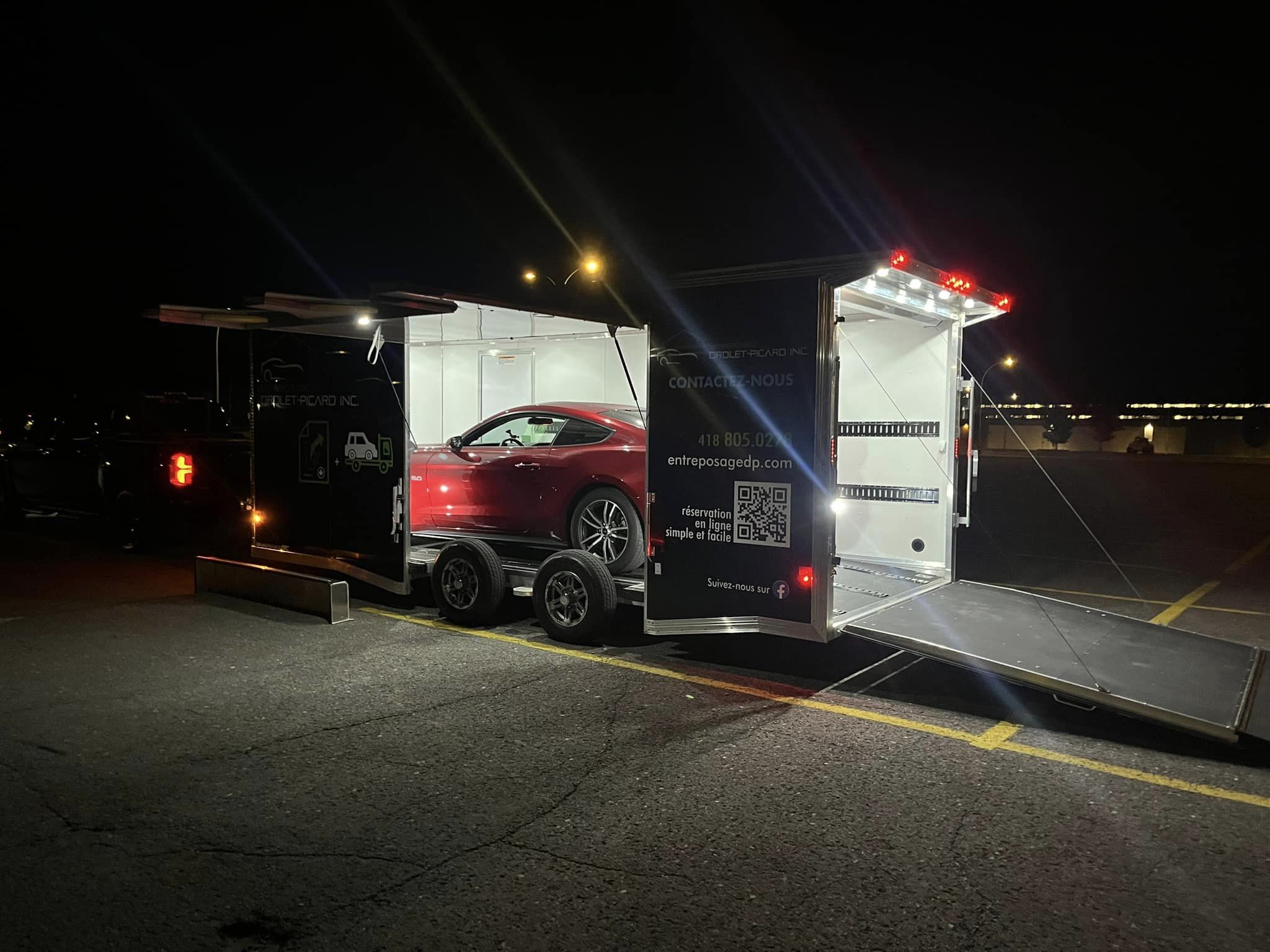 Dans le cas d’un gros déploiement, le déplacement des véhicules se fera sur une remorque adaptée, de la base à un de nos entrepôts sécurisés.